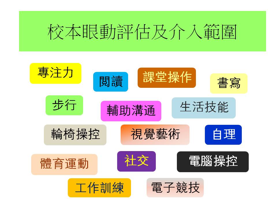 本校於2012-15年所推行的「QEF 睛讀計劃」及於2016-17年與香港理工大學進行的「小一至小三學童眼球肌肉協調訓練與認讀中文字詞能力」 研究計劃,已證明為身體弱能兒童進行針對性的眼睛追視訓練,能有效提升視覺專注、聚焦準確度及認讀能力。繼往開來,職業治療部及教學部於2018年成立「眼睛活動行動研究」 (Action Research of Eye Movement ) 小組,運用「移動式眼動儀」(Mobile Eye Tracker),為學生進行課堂「實時實地」的眼睛活動(眼動)評估,量度及分析眼睛活動狀況,從而進行相關治療,改善讀寫技巧並作調適學與教模式 (如環境設計、閱讀媒體及教授方式) 的參照。