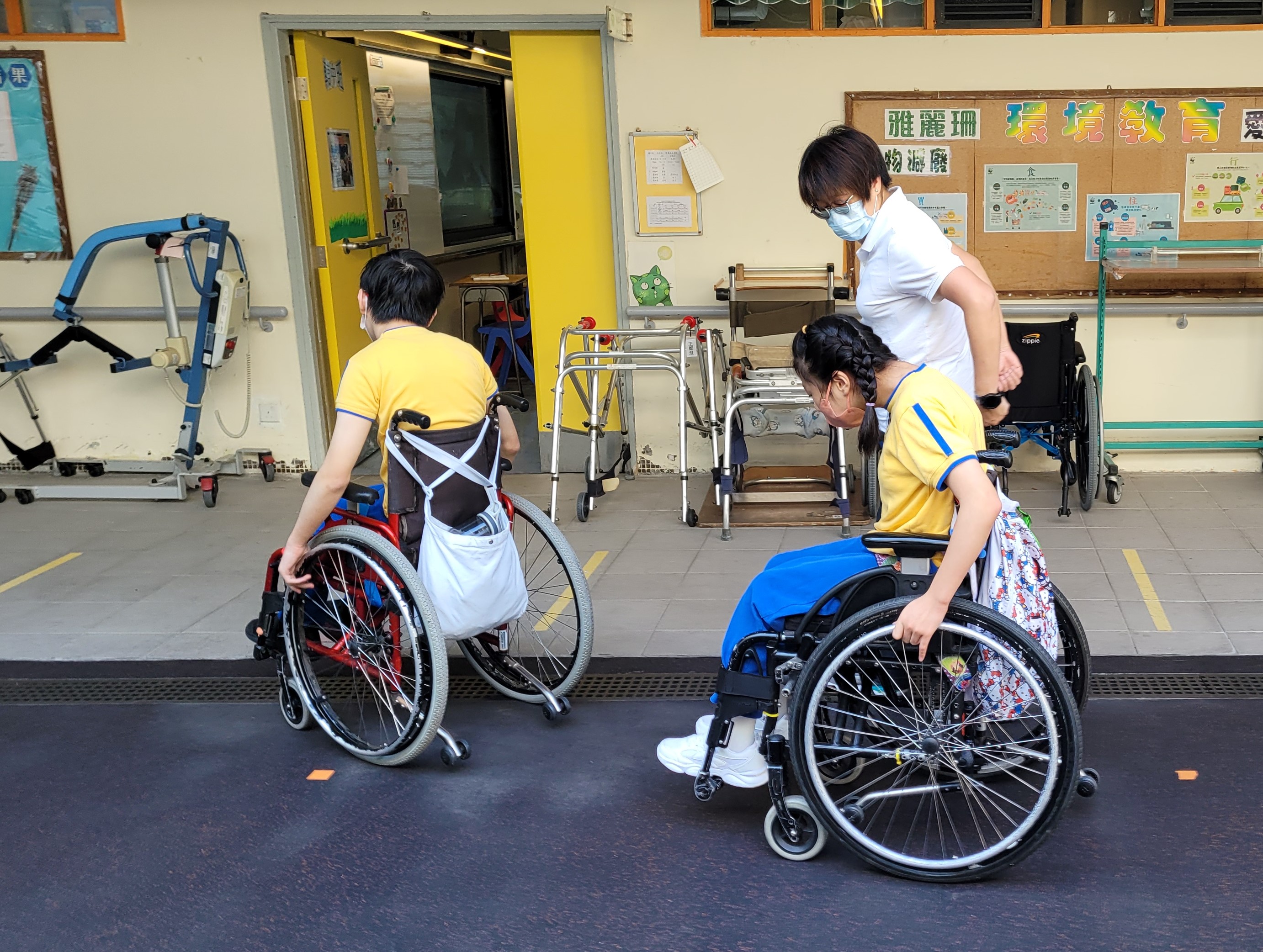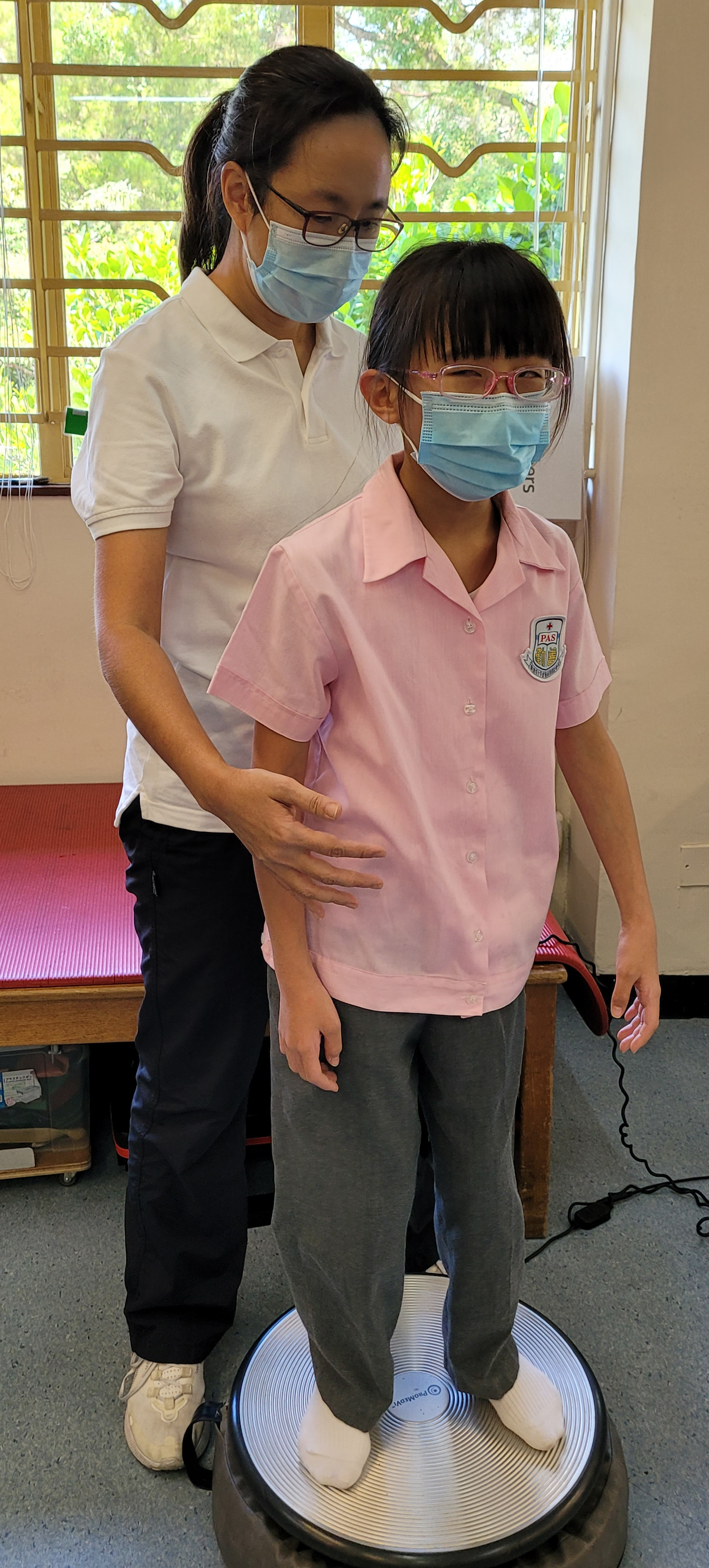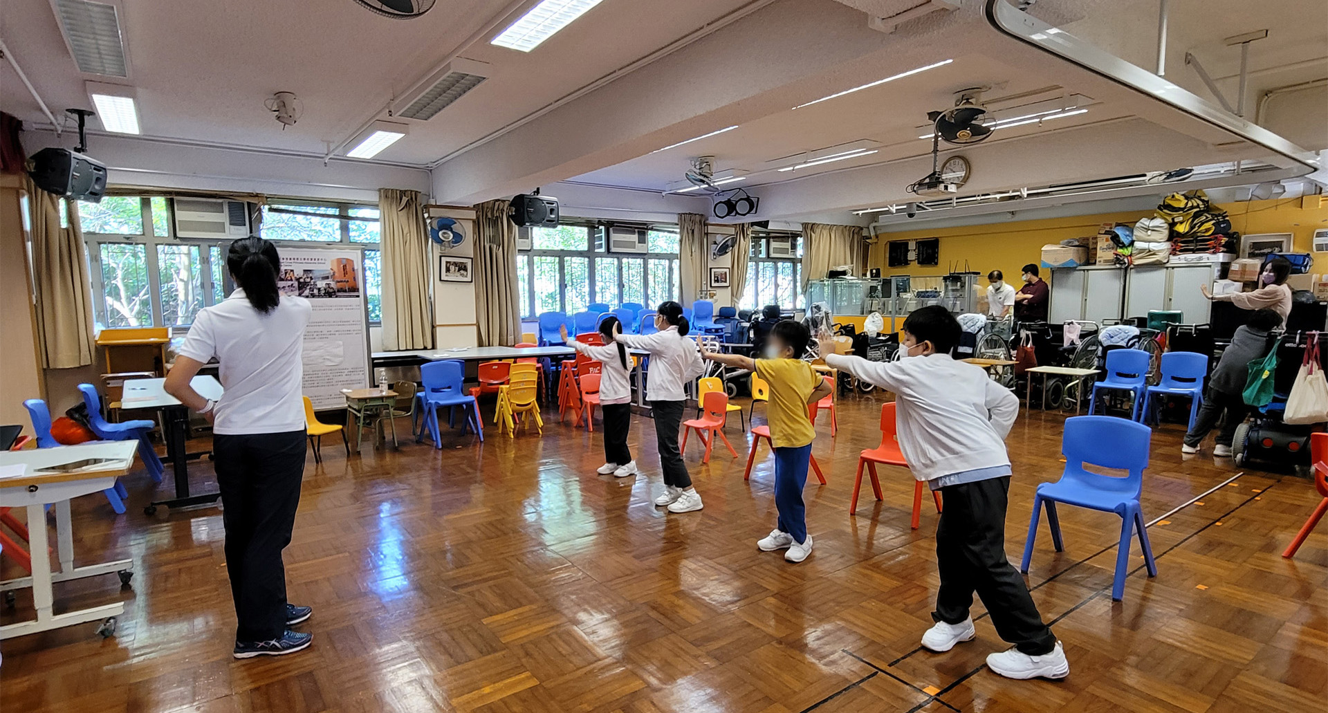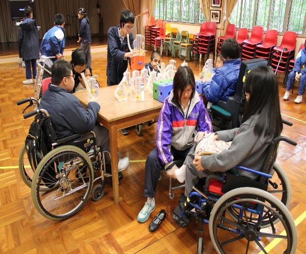 透過貫通式團隊協作模式,與老師及各專業同事共同訂定學習或活動目標,將訓練融入於部份班級的早操、體育、生活技能課、工作體驗堂、健康生活與社會關懷堂及體藝活動內。亦參與設計整日的生活流程,融入物理治療元素,使學生時刻都有接受治療的機會。
