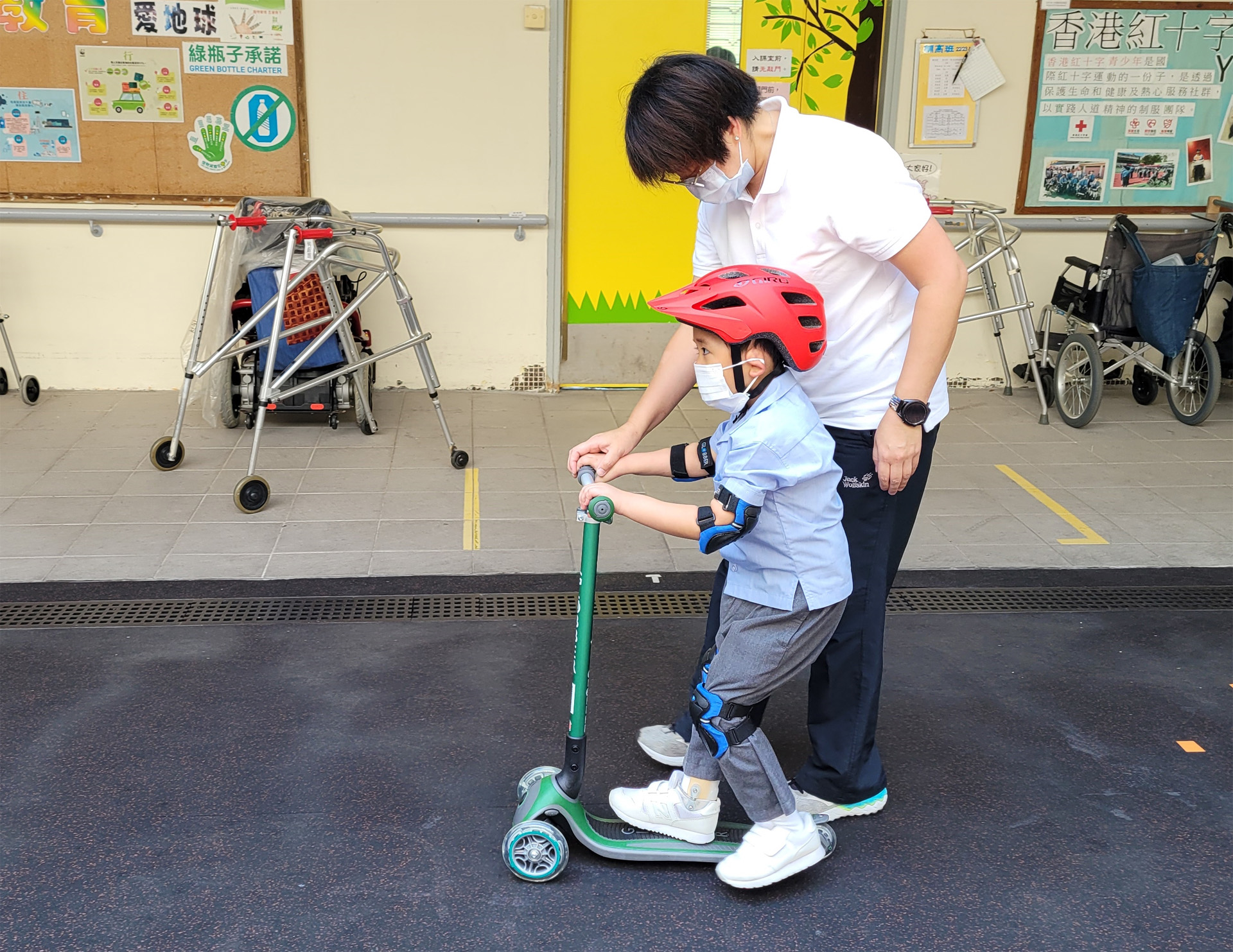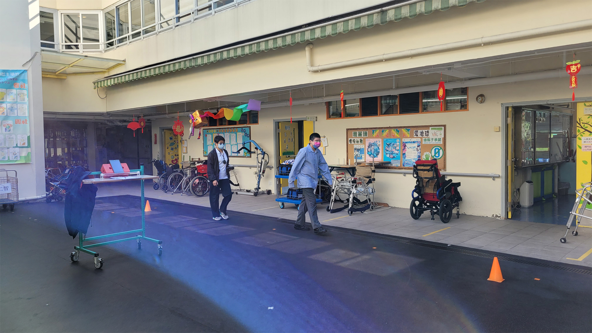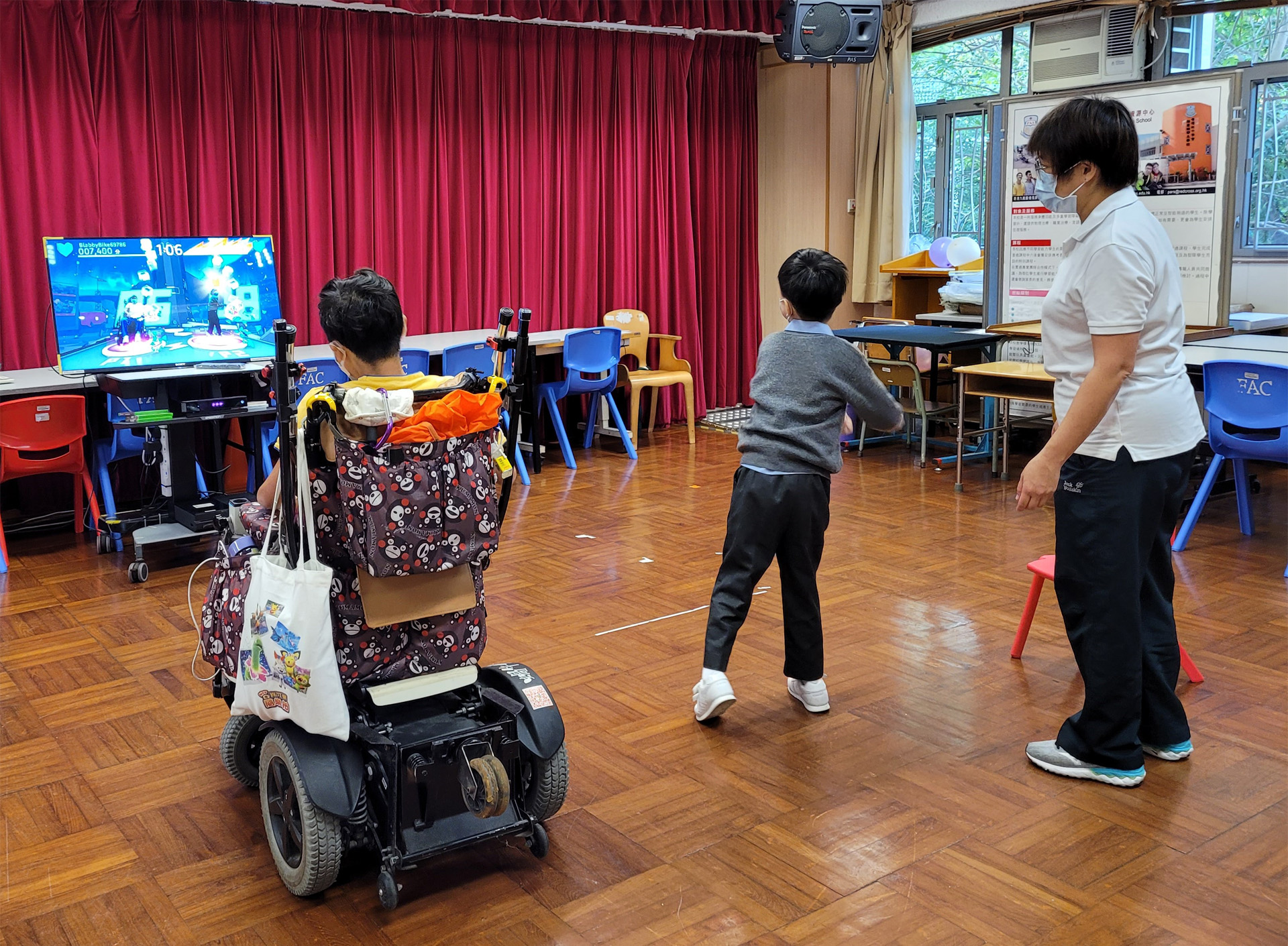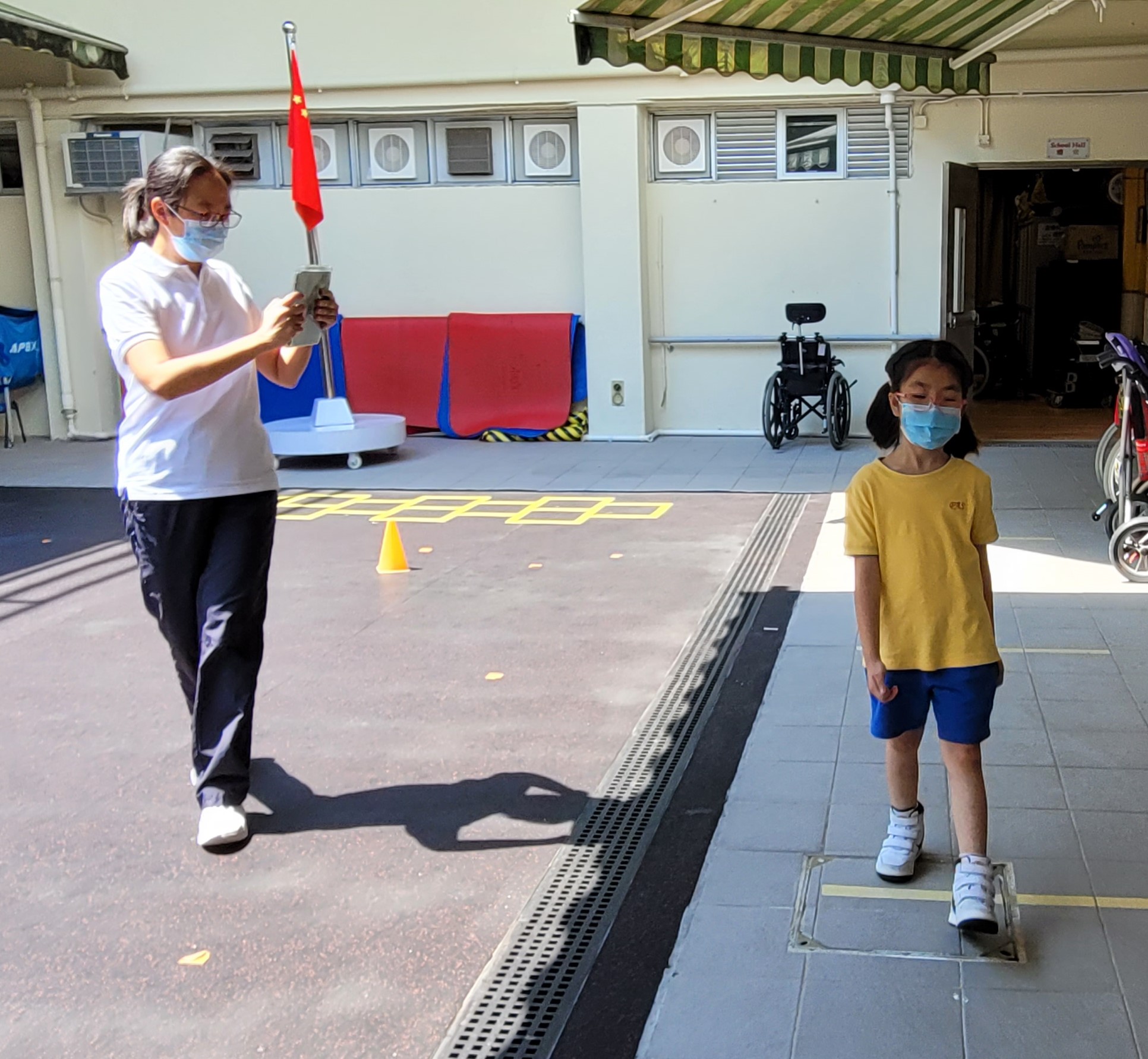 透過貫通式團隊協作模式,與老師及各專業同事共同訂定學習或活動目標,將訓練融入於部份班級的早操、體育、生活技能課、工作體驗堂、健康生活與社會關懷堂及體藝活動內。亦參與設計整日的生活流程,融入物理治療元素,使學生時刻都有接受治療的機會。