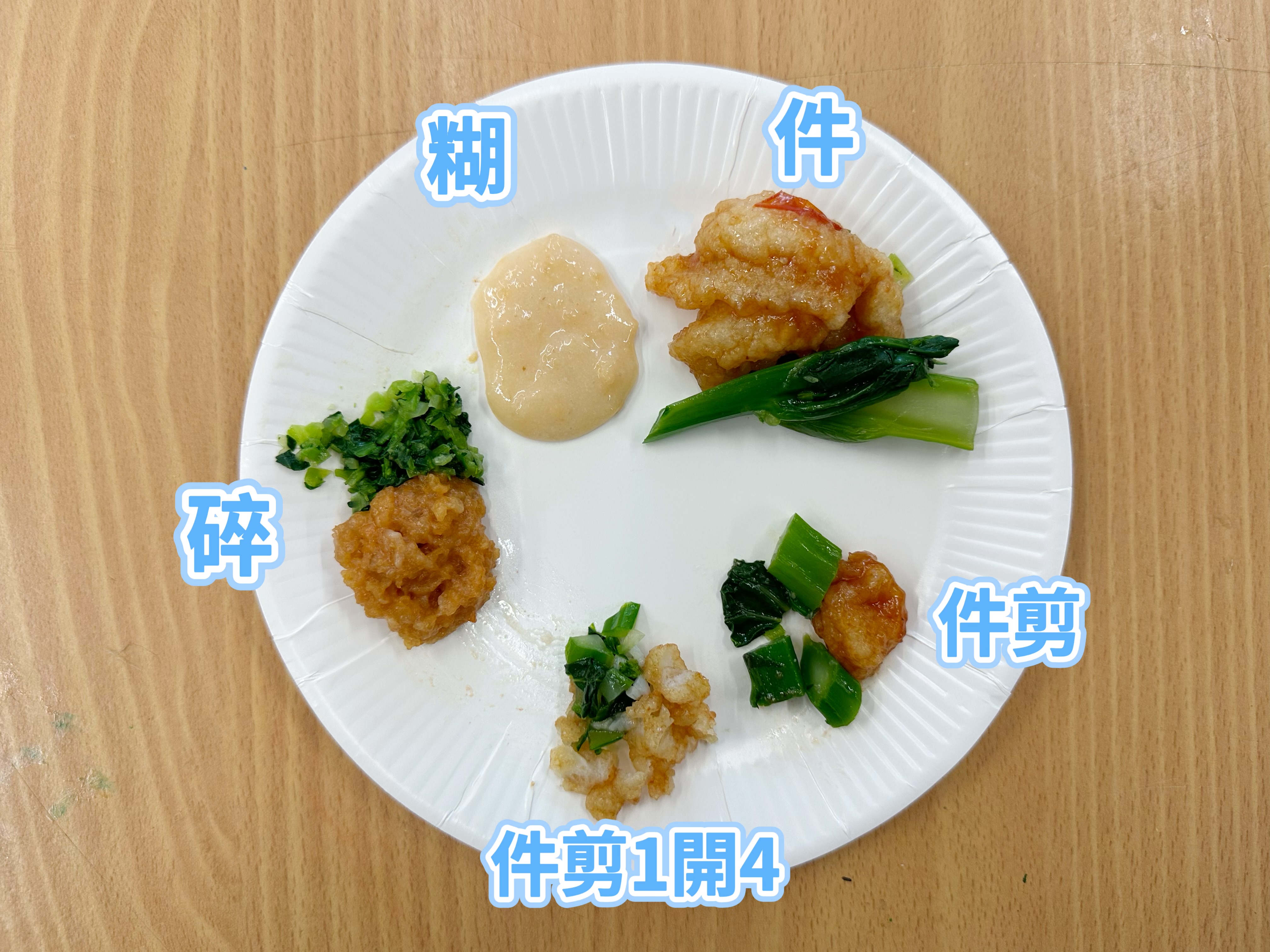 本校提供不同質地的餐類,以配合不同能力學生的需要。言語治療部近年亦開始從坊間機構引進照護食 (Care food) (廣稱為「軟餐」) 讓學生嚐試,軟餐食物的形態和軟硬程度經過特別調整,其外型不但與該食物的原狀胋近,還保留了食物的色香味,除了令吞嚥困難患者能安心進食外,也令他們進食得有尊嚴。