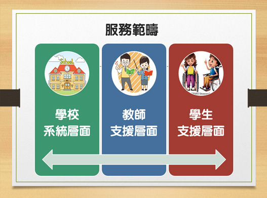 - 向教師、家長及各相關的專業人士提供諮商服務,使學生得到最適切的照顧與支援。