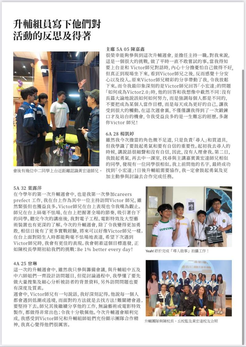 今年本校70週年校慶主題為「傳承、創新」,我們很榮幸邀請到傑出校友黃宏達先生作為升輔週會主講嘉賓。