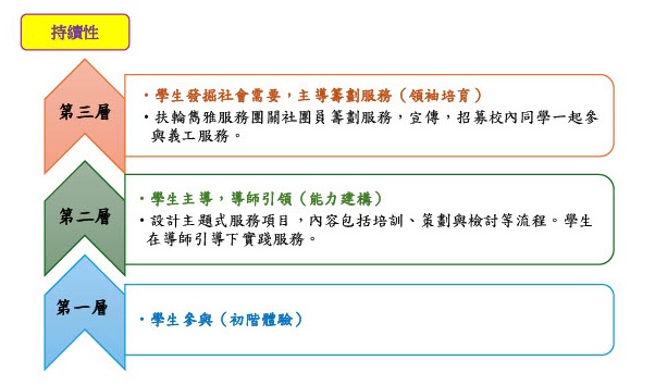 因應學生的年齡和能力發展,我們建立「三層服務學習架構」,為不同年級學生提供循序漸進、多元化的實踐機會: