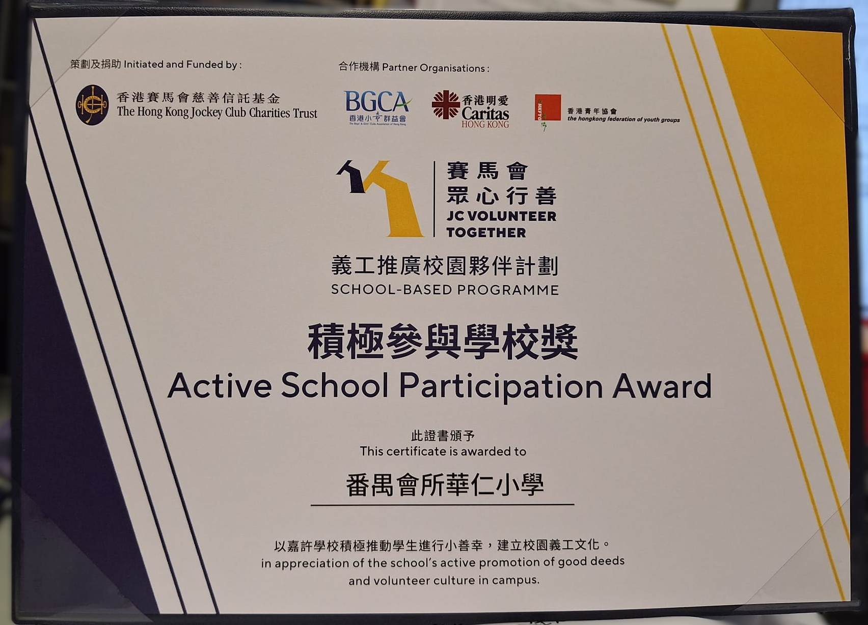 - 本校已參與香港明愛青少年及社區服務舉辦的「明愛出色小義工獎勵計劃」,為高小學生積極服務社群的貢獻予以肯定。
