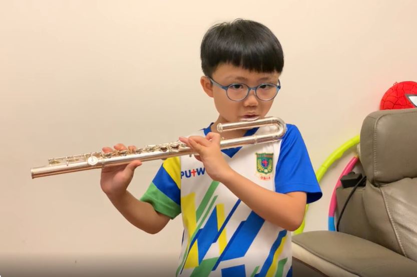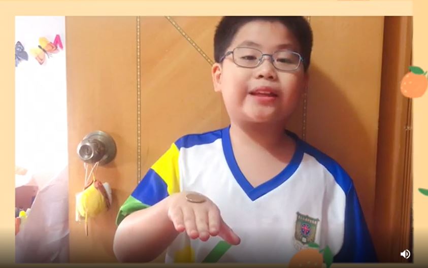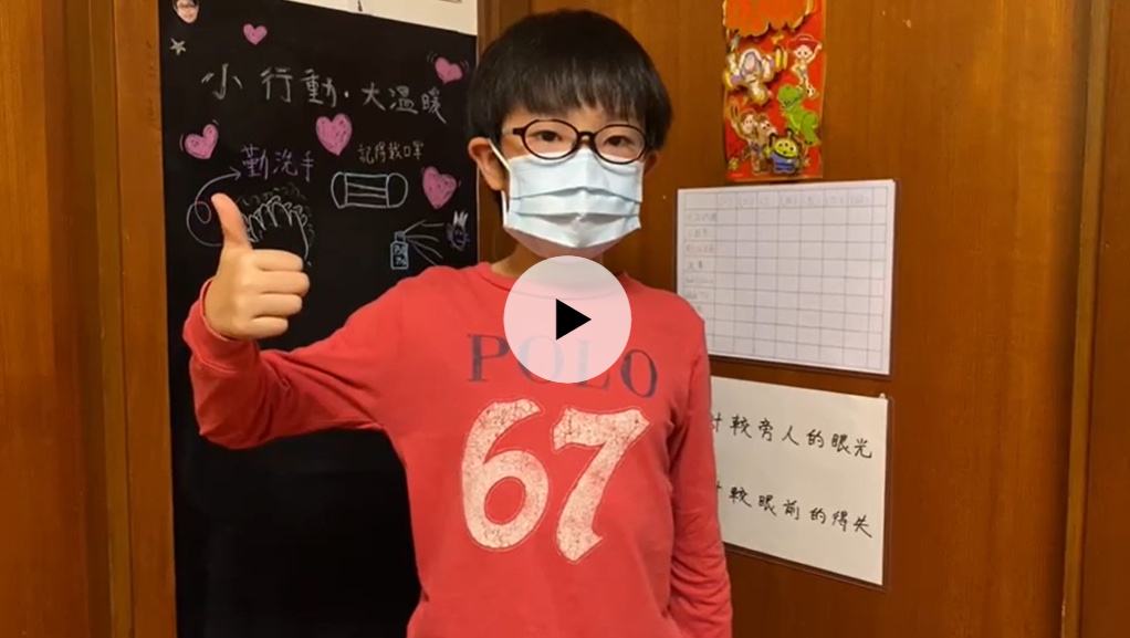 | 二禮班陳信杰吹奏樂曲送給全港市民。 | 三仁班鄧鉅橋同學拍片教長者戴口罩。 |