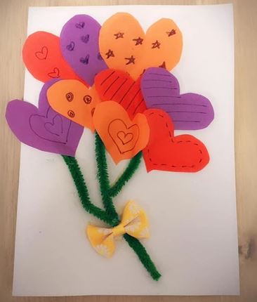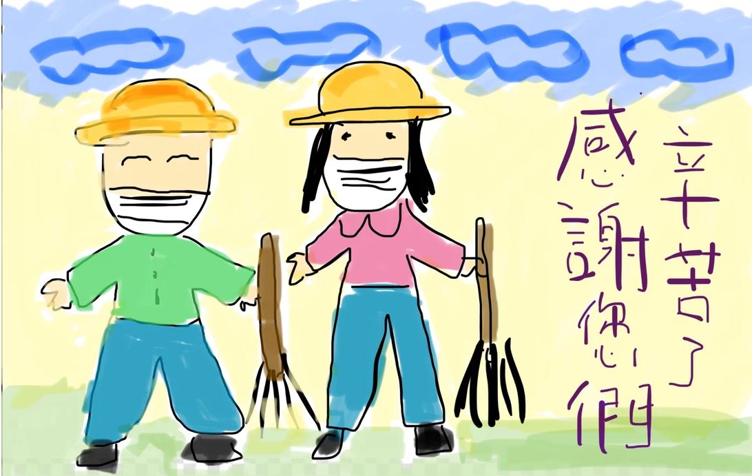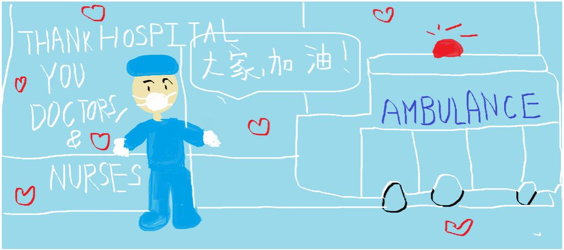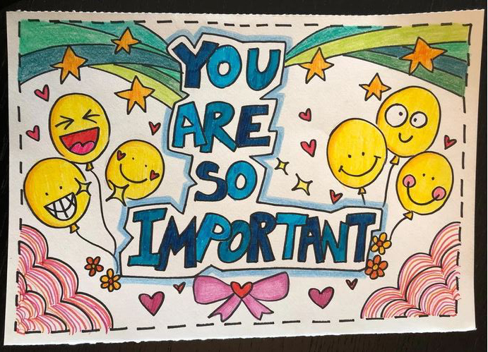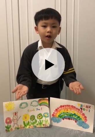 | 一仁班徐子諾同學的手工紙花滿載祝福。 | 二禮班林傲懿同學拍短片及繪畫心意卡為醫護人員打氣。 |